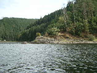 Der Tauchplatz mit den legendären Welssichtungen!!! Es handelt sich um eine stark zerklüftete, fast kerzengerade Wand, in den Nischen, die von umgestürzten Bäumen gedeckt sind. Hier hocken tagsüber die Welse (der bisher größte gesichtete Wels hatte über 2m).